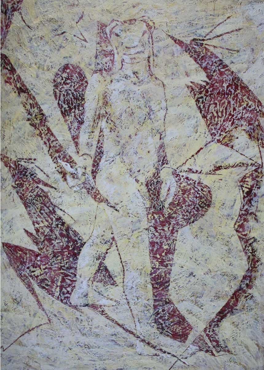 Three strands of ideas for a painting started to develop: the human figure, the Lion Man head and bird motifs from one of my sketch books. The birds represent the news: “following the science”, the hardships of many and of course “fake news”. Quite often the title for a painting comes early in the process, “We Have Been Here Before” is a fair statement of my intent for this painting.